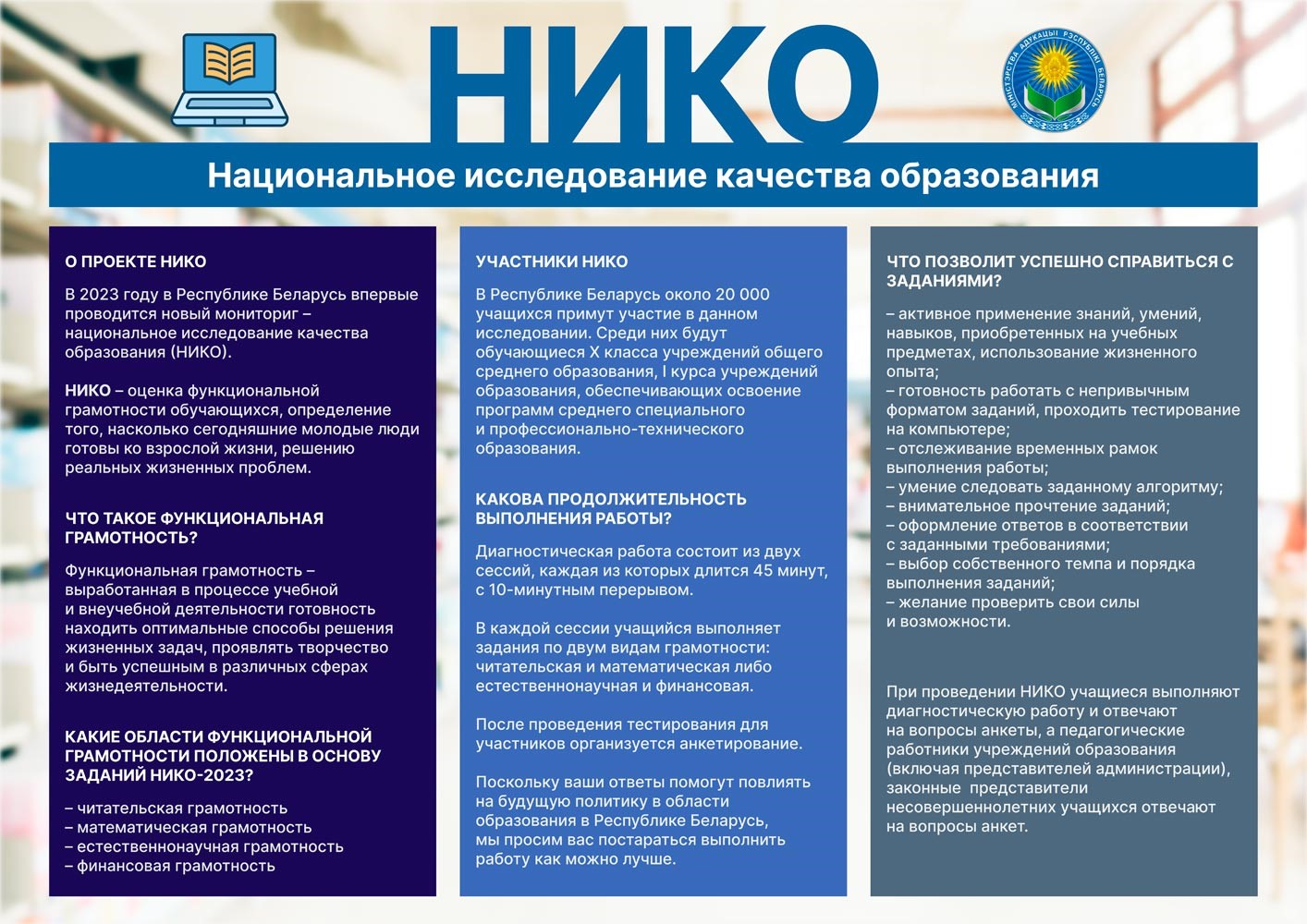 НИКО проверит четыре вида функциональной грамотности — читательскую, математическую, естественнонаучную и финансовую. Задания будут отличаться от привычных контрольных работ тем, что их содержание нацелено не на проверку знаний по учебной программе, а на оценку умений применять полученные знания в жизни.